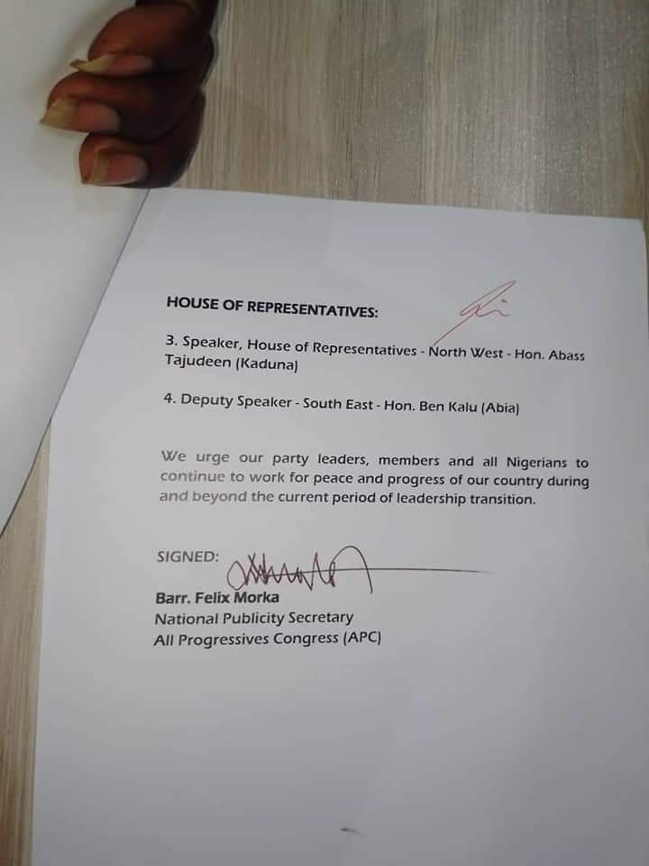 Also, Honourable Abbas Tajuddeen from North West (Kaduna) and Hon Ben Kalu from from South East (Abia) for penciled for Speaker and Deputy Speaker respectively.