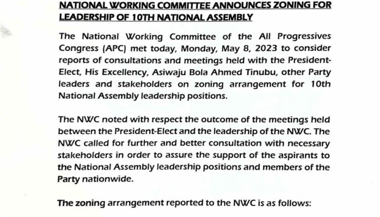 He said, “The National Working Committee of the All Progressives Congress (APC) met today, Monday, May 8, 2023 to consider reports of consultations and meetings held with the President-Elect, His Excellency, Asiwaju Bola Ahmed Tinubu, other Party leaders and stakeholders on zoning arrangement for 10th National Assembly leadership positions.