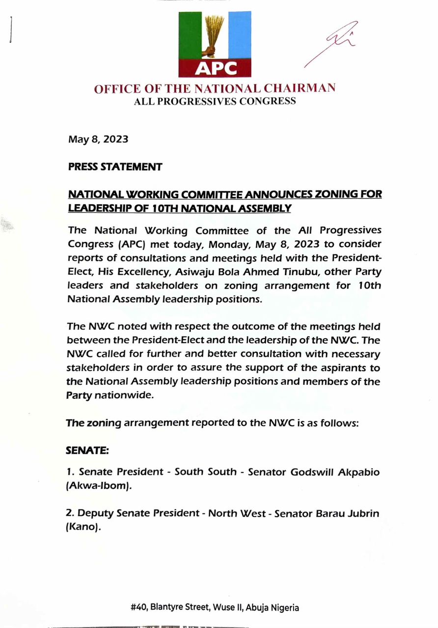 “The zoning arrangement reported to the NWC is as follows: Senate:1. Senate President – South South Senator Godswill Akpabio (Akwa Ibom) and the Deputy Senate President – North West-Senator Barau Jubrin (Kano).