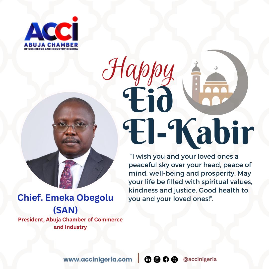 The President of the Abuja Chamber of Commerce and Industry (ACCI), Chief Emeka Obegolu, SAN, extends his heartfelt felicitations to the Muslim faithful on the auspicious occasion of the 2024 Eid Mubarak celebration.