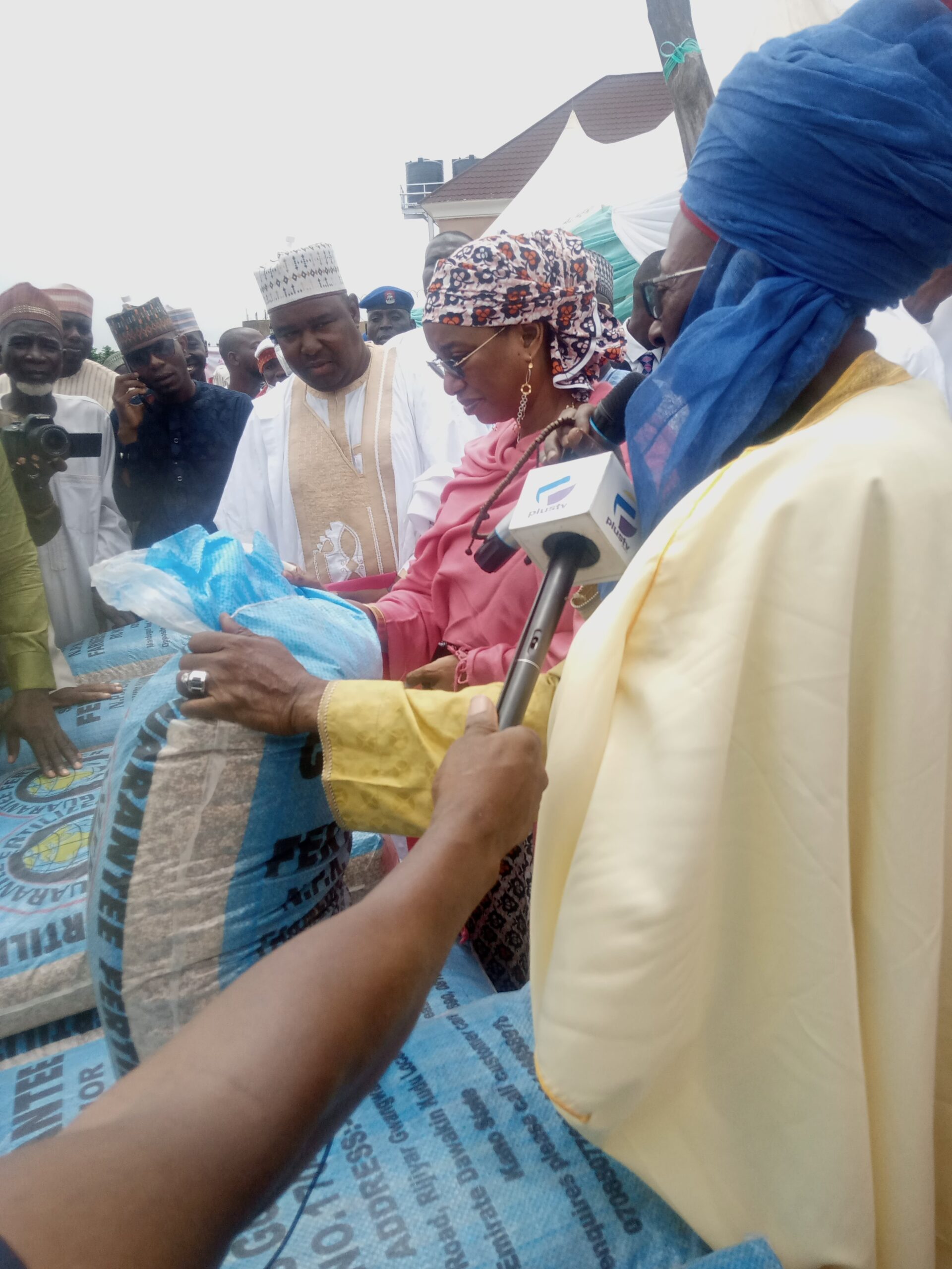 The All Progressives Congress (APC) governorship candidate in Adamawa State, Senator Aishatu Dahiru Ahmed Binani has distributed 16, 800 bags of grains including fertilizer across the 21 local government areas of the state.