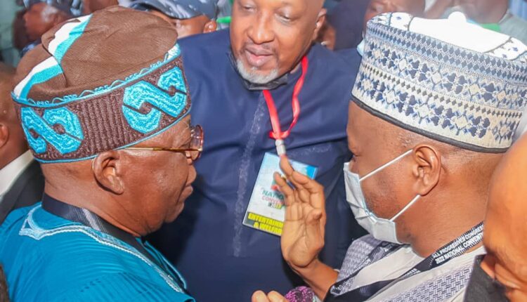 Gombe Governor Inuwa Yahaya, right, exchange pleasantries with Asiwaju Tinubu, left, and other dignitaries at the convention ground in Abuja