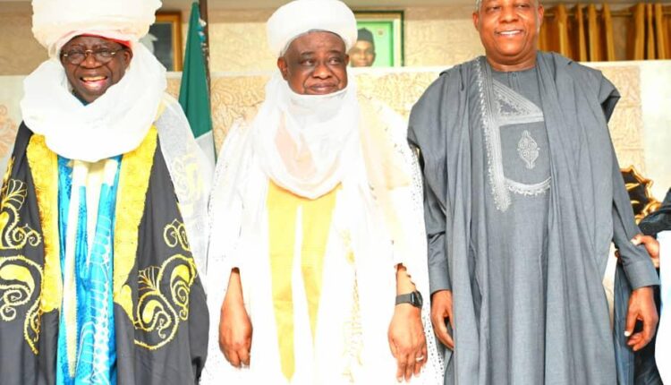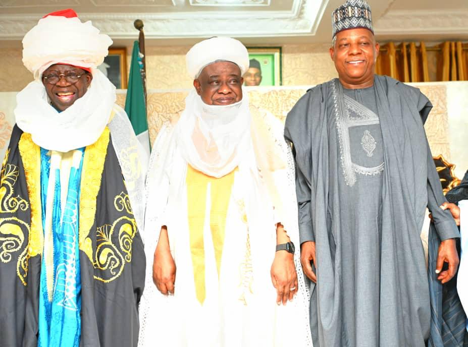 From left:Asiwaju Tinubu after he was turbanned as Dakare ( Generalissimo) of Birnin Gwari, the Emir and Senator Kashim Shettima