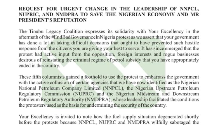 Specifically, the Tinubu Legacy Coalition (TLC) in a private letter to President Tinubu demanded the removal of Mele Kyari, Gbenga Komolafe and Farouk Ahmaed as heads of the Nigerian National Petroleum Company Limited (NNPCL), Nigerian Upstream Petroleum Regulatory Commission (NUPRC) and Nigerian Midstream and Downstream Petroleum Regulatory Authority (NMDPRA) respectively.