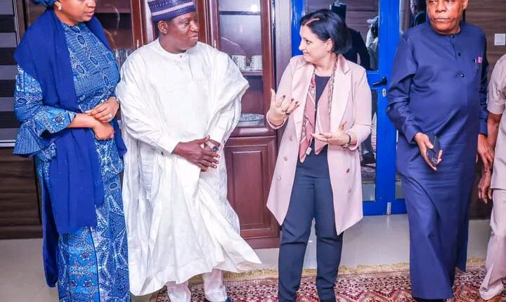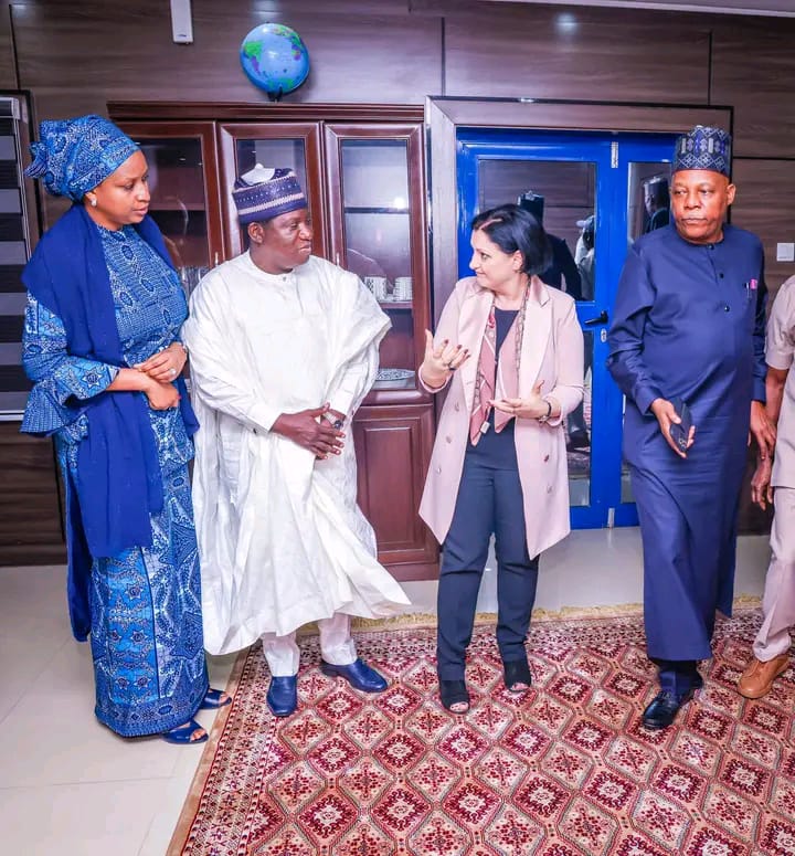 The Vice Presidential Candidate of the APC Senator Kashim Shettima and Director General of the PCC and Governor of Plateau State, Rt. Hon. Simon Bako Lalong on Thursday 6th October, met with the European Union Ambassador to Nigeria Ms. Samuela Isopi at the Tinubu Campaign Headquarters in Abuja.