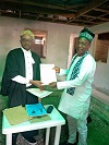 Outgoing chairman, Barrister Joel Luka gives the certificate of return to Mr Anthony Maliki, right, after the swearing in