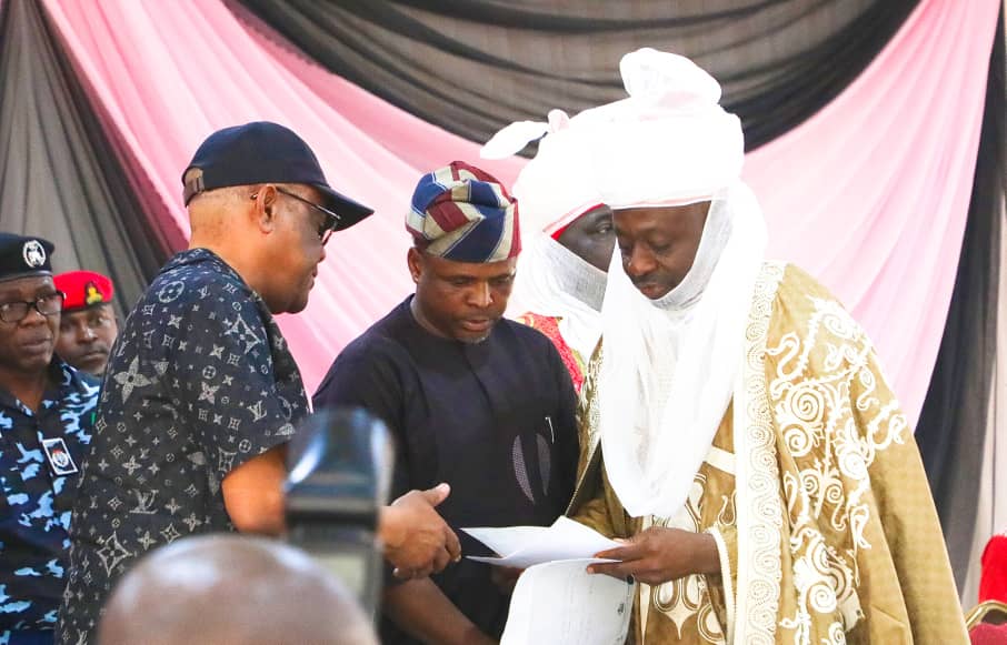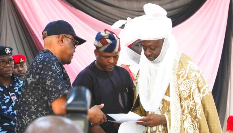 L-R: FCT Minister, Barrister Nyesom Wike, Chairman, Bwari Area Council Dr John Gabaya and Etsu Bwari HRH Ibrahim Yaro conferring during the townhall meeting on security in Bwari on Wednesday, 17th January, 2024