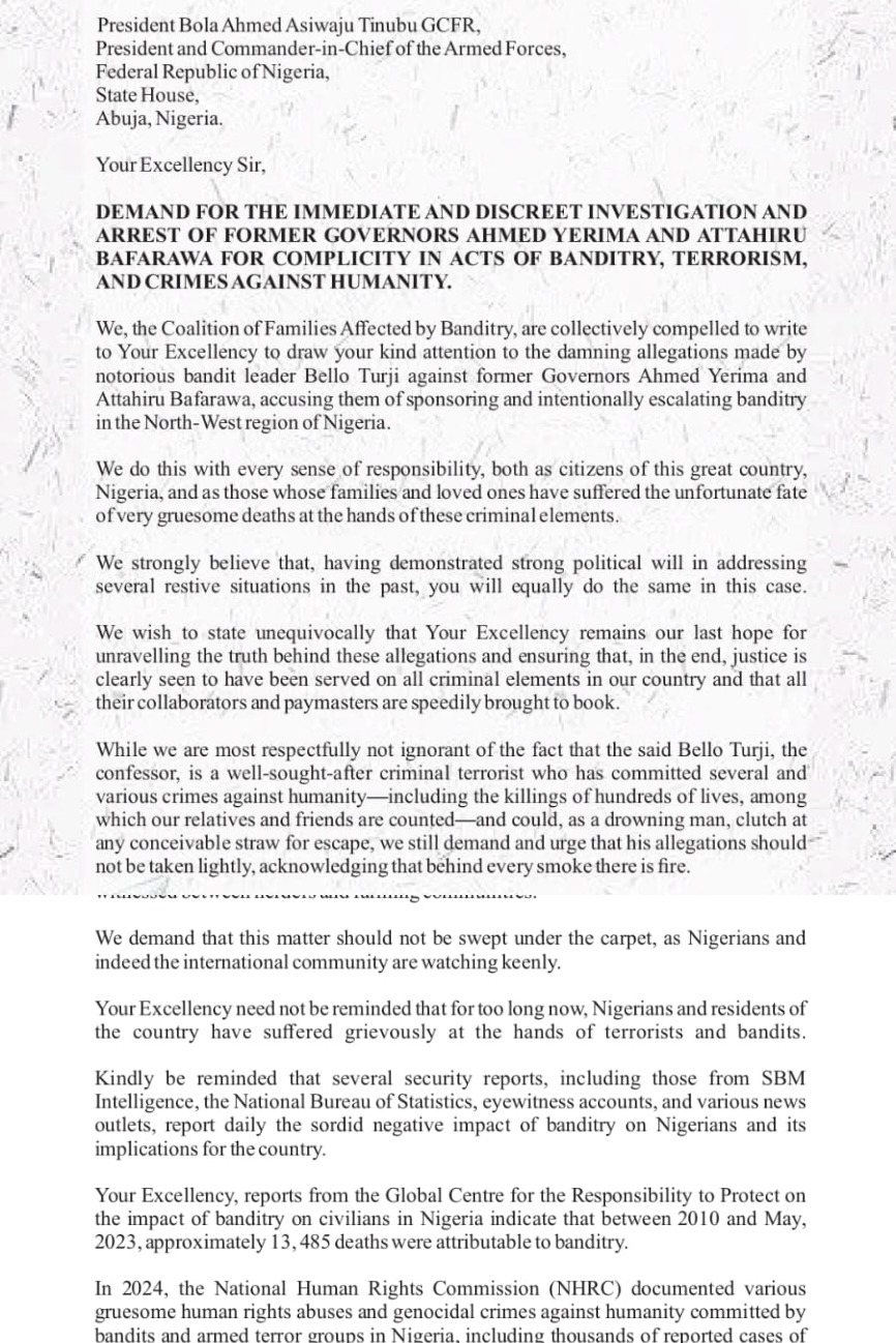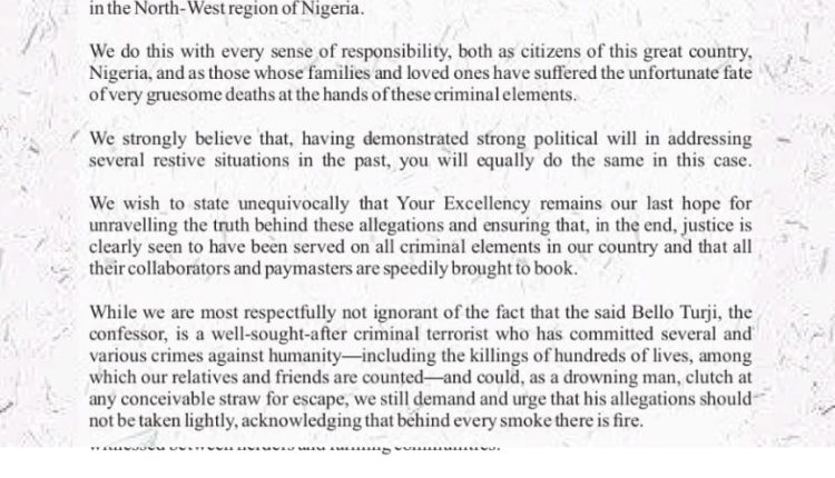“We write to Your Excellency with a profound sense of urgency and responsibility, seeking your support in addressing grave allegations recently made public by notorious bandit leader Bello Turji.