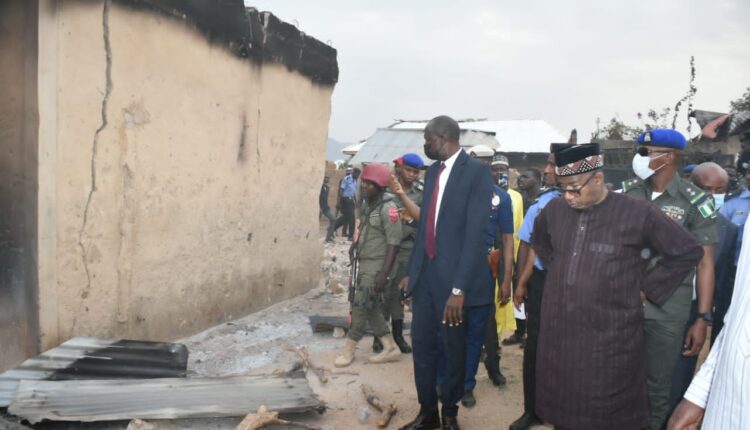 Governor Bala Mohammed, right, inspects burnt houses at Gudum Hausawa