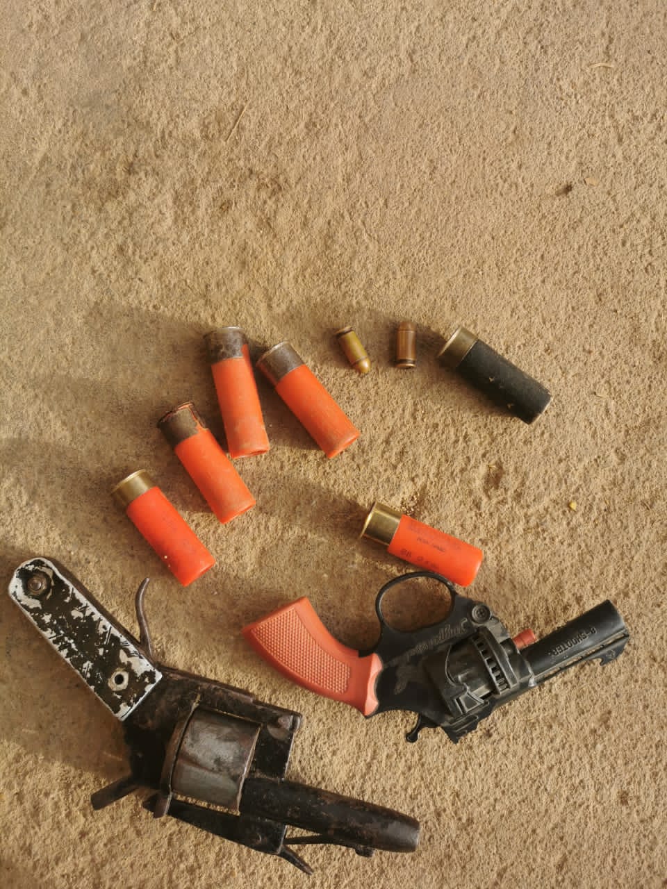 “During the arrest, the following items were recovered: One (1) locally made pistol with two (2) rounds of live ammunition, One (1) toy pistola, one (1) machete, six (6) cartridges, four (4) laptops, one (1) laptop charger, one (1) laptop battery, five (5) Android phones with one keypad phone, one power Bank, one mp3 Head phone,” the release read in part.