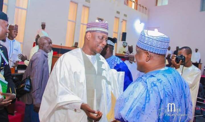 Speaker, Bauchi State House of Assembly, Abubakar Y Suleiman with former Speaker, Kawuwa Shehu Damina, right