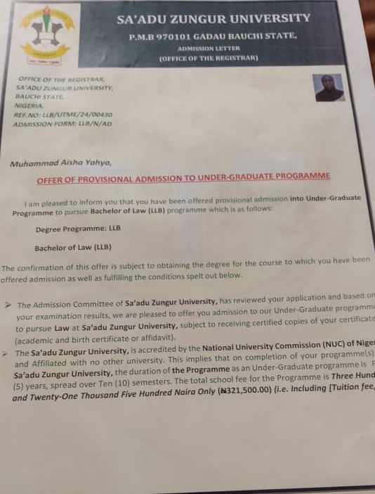 The University in a statement on Friday, stated that, “Attention of the Management of Sa’adu Zungur University has been drawn to a fake admission letter, supposedly from the University, issued to one Muhammad Aisha Yahaya, offering admission to study Bachelor of Law (LLB).”