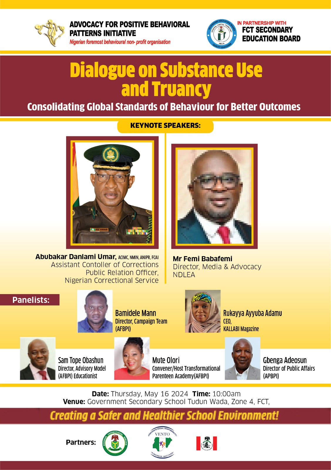The Advocacy for Positive Behavioural Patterns Initiative (APBPI) in partnership with FCT Secondary Education Board is holding a “Dialogue on substance use and truancy” on Thursday 16 May, 2024 as part of its desire at consolidating global standards of behaviour for better outcomes.