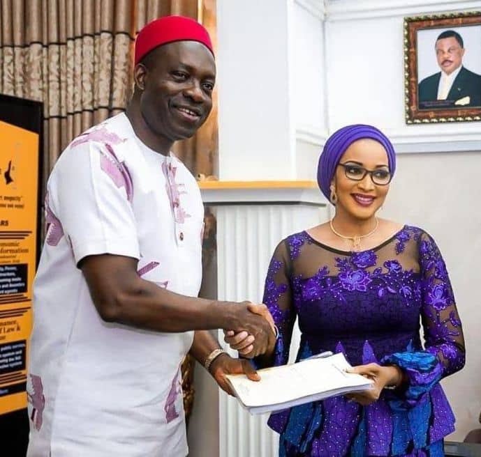 Governor Soludo receives the Commission report from Bianca Ojukwu, right