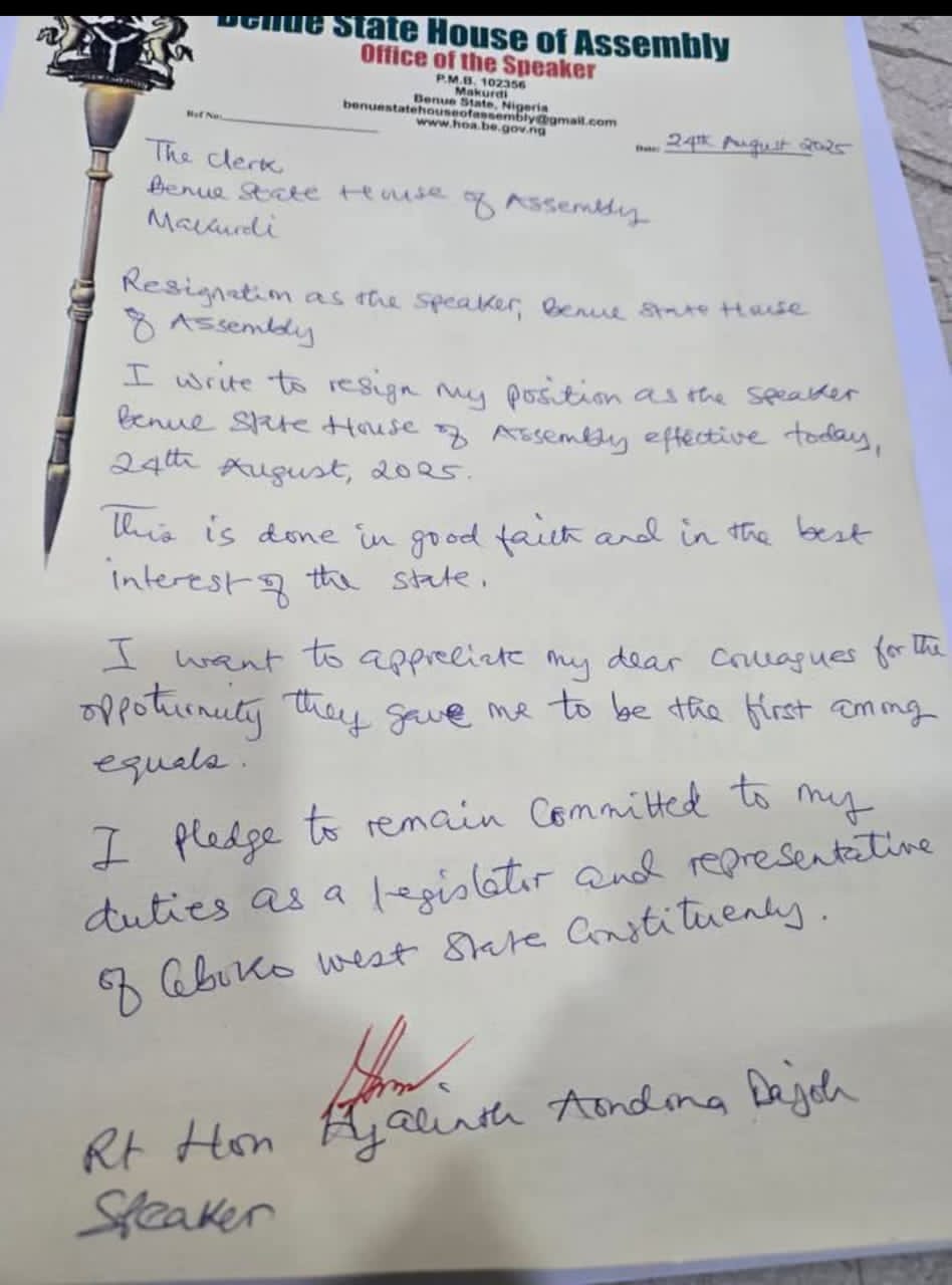 The Speaker of the Benue State House of Assembly, Rt. Hon. Hyacinth Aondona Dajoh, has resigned from the position with immediate effect.