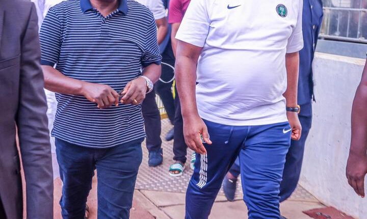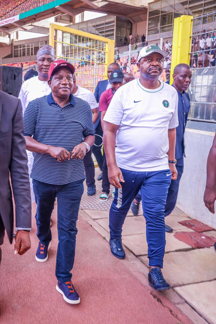Plateau Governor, Lalong with Minister of Sports, Sunday Dare, right, at the stadium