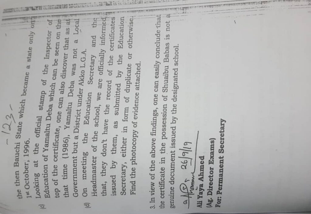 In its submission, the Gombe State Ministry of Education declare the certificate invalid, null and void, because of it forgery status.
