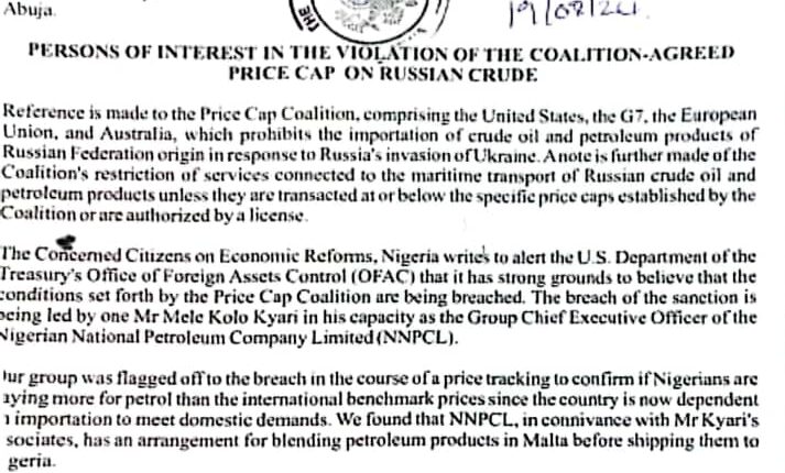 A group of concerned Nigerian citizens has petitioned the US government to investigate and sanction the Nigerian National Petroleum Company Limited (NNPCL) and its CEO, Mele Kyari, for allegedly violating sanctions on Russian crude oil.