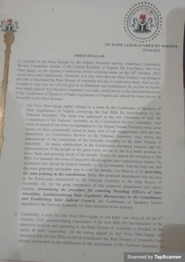Conference of Speakers of State Legislatures of Nigeria has declared that the press release recently authored by the Deputy President and Chairman, Constitution Review Committee, Senate of the Federal Republic of Nigeria, Sen Ovie Omo-Agege on the ongoing Constitution review exercise made on the 18th October, 2022 was designed not only blackmail the State Houses of Assembly but also to undermine them.