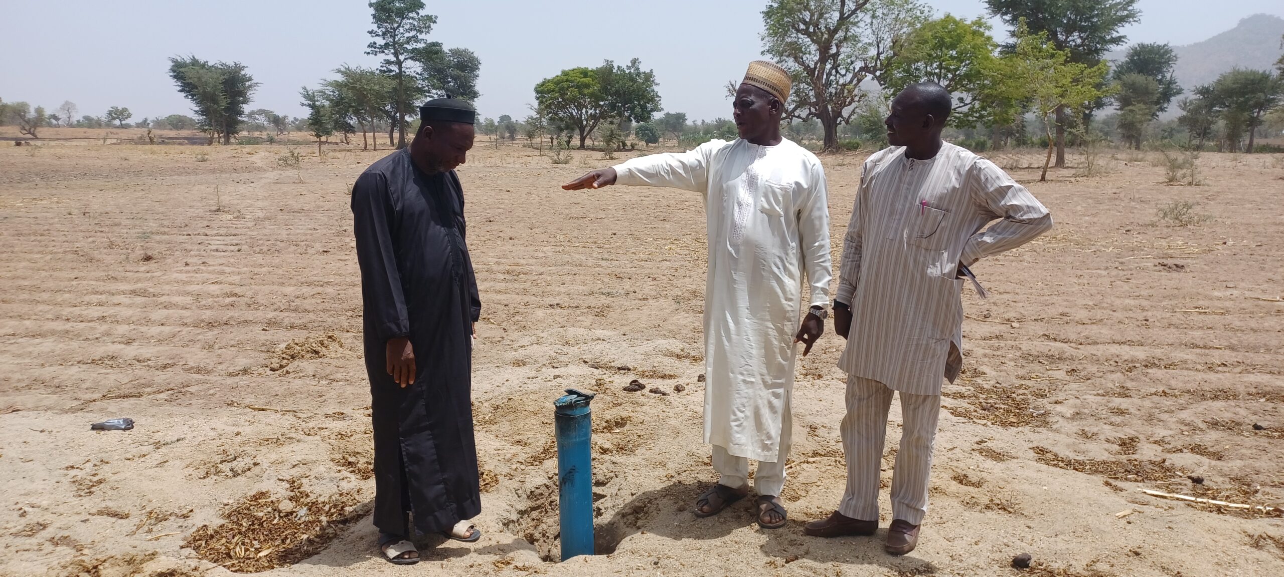The village Head of Dasham Bakin Kogi, Mr Yunana Joshua (left) and Community Development Association Chairman, Simon Arbe conduct members of WASH Media round the borehole.