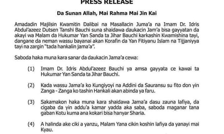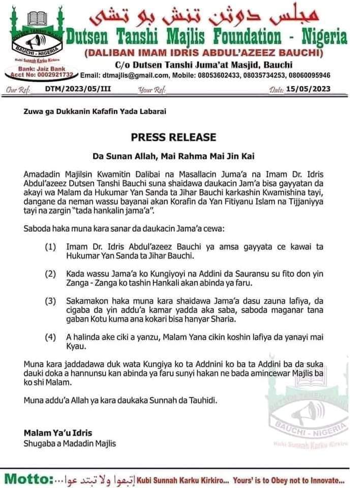 The release further contained that, he is accused of “inciting public opinion”: Therefore, we further inform all the people that: Imam Dr. Idris Abdul’azeez Bauchi responded only to the invitation of the Bauchi State Police Commissioner on 15/05/2023.