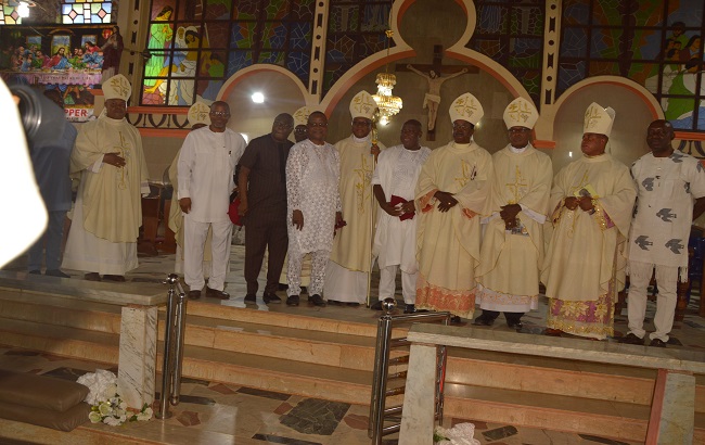 Catholic Bishop of Awka Diocese, Most Rev. Paulinus Ezeokafor (4th right) with other bishops, Dr. Josephat Kanayo OKoye (7th right) and some government officials after the Mass, St. Paul’s Parish, Obeledu.