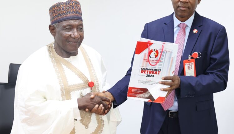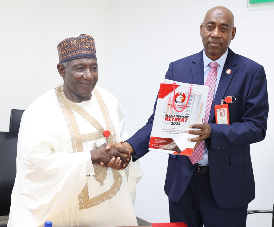 Alhaji Aliyu Kiliya, National President, Nigeria Association of Auctioneers (left) with Mr Muhammad Hammajoda, Secretary of the Economic &Financial Crime Commission during a courtesy visit to EFCC chairman by the Auctioneers in Abuja.
