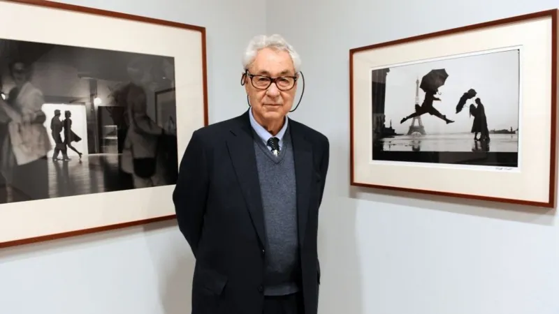 An 82-year-old Erwitt poses in front of some of his work at an exhibition in Paris, where he was born in 1928