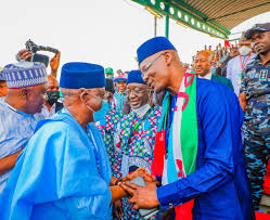 Senator Tanko Almakura exchange greetings with Nasarawa State Governor, Engineer Abdullahi Sule at APC national convention on March 26, 2022