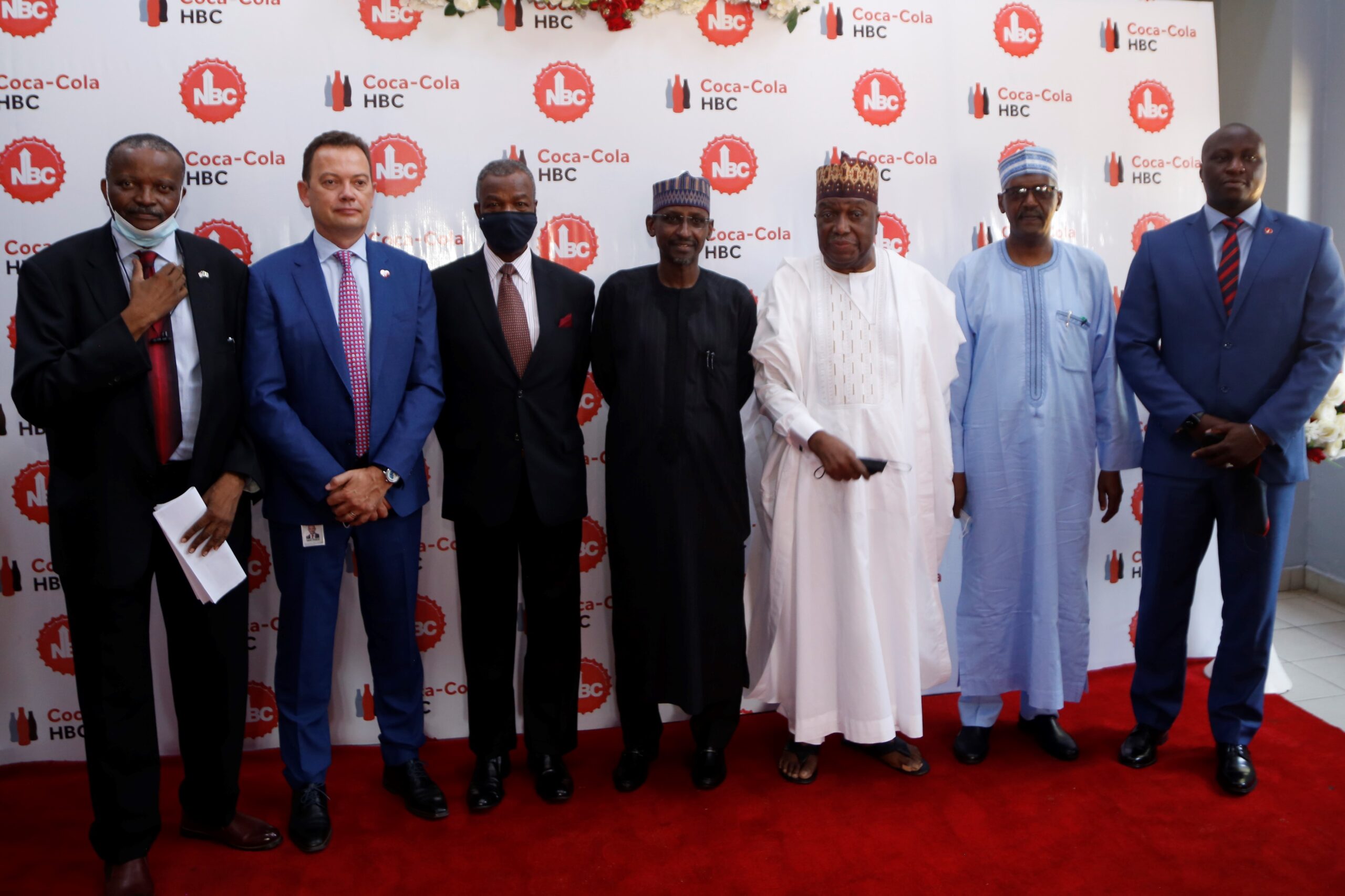 (L-R), NBC Board member, Laolu Akinkugbe,  MD, NBC, Matthieu Seguin, NBC Chairman, Ambassador Segun Apata, FCT Minister, Malam Muhammad Musa Bello, Chairman, Leventis Group Alh Ahmed Mantey, Chief of Staff  to FCT Minister, Malam Bashir Mai-Bornu, MD, Coca-Cola Nigeria Ltd, Alfred Olajide during the FCT Minister’s visit to NBC Plant in Abuja on Tuesday.