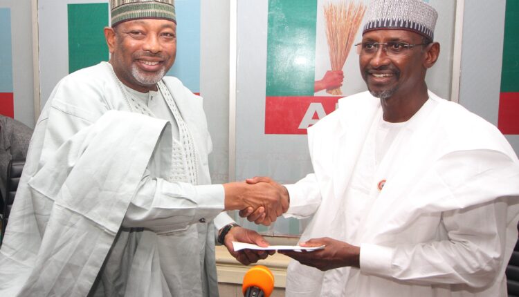 FCT Minister, Malam Musa Bello (right) presents a letter of appreciation and congratulations on behalf of the FCT Administration to the APC Deputy National Chairman (North) Senator Abubakar Kyari at the APC National Secretariat, in Abuja