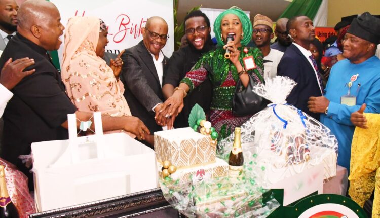 FCT Minister, Barrister Nyesom Wike (3rd left) assisted by the Minister of State, Dr Mariya Mahmoud (2nd left) and senior officials of the FCTA, cutting his birthday cake during a mini reception held in his honour on Wednesday.