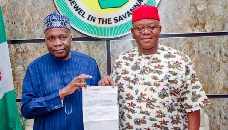 Gombe state Governor, Muhammadu Inuwa Yahaya with the Chairman, Editorial Board of Vanguard Newspaper, Ocherome Nnana, right