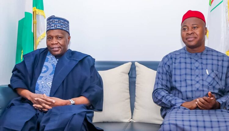 Gombe Governor, Inuwa Yahaya with Director General of NALDA, Prince Paul Ikonne, right, in his office in Abuja