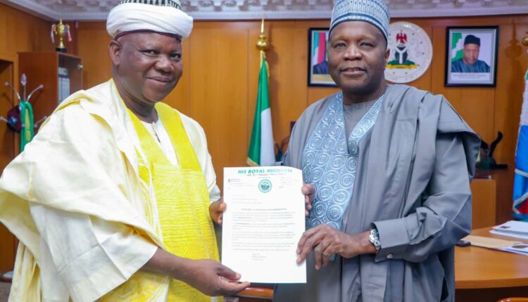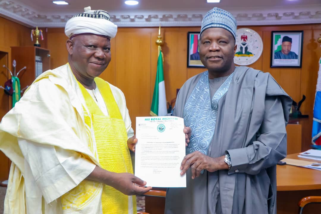 Chiroman Tula and District Head of Baule, Ibrahim Hassan presenting letter of conferment to Gombe State Governor, Muhammadu Inuwa Yahaya, right