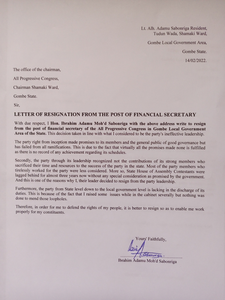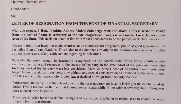 The spate of resignation by aides of Gombe State Governor, Muhammadu Inuwa Yahaya has gradually crept into the structure of the ruling All Progressives Congress (APC) in the state as the Financial Secretary of the party in Gombe Local Government Area, Ibrahim Adamu Sabon Riga, has resigned from his position as well as membership of the party.