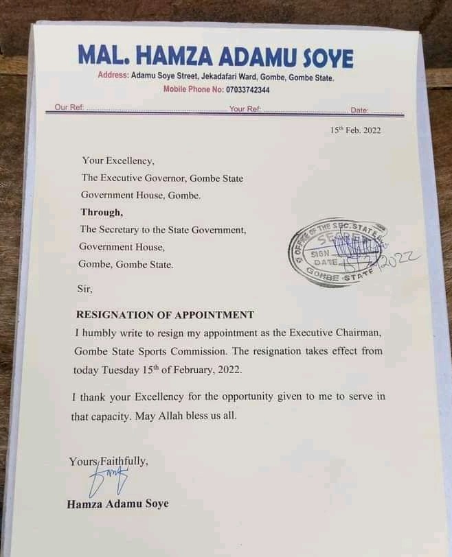 Similarly, the executive chairman of the Gombe State Sports Commission, Malam Hamza Adamu Soye Tuesday tendered his resignation letter to the governor.