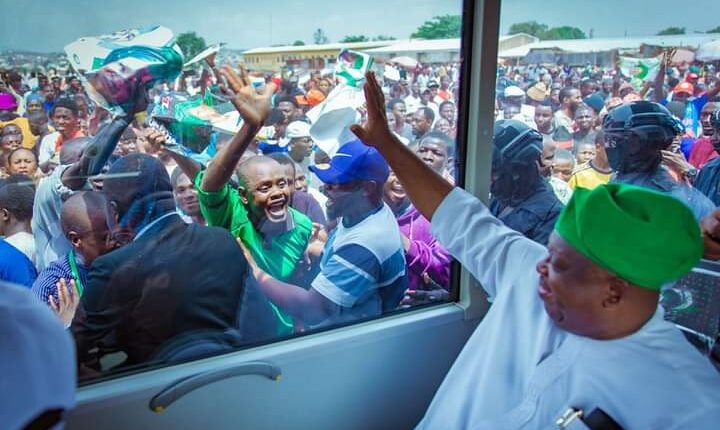 Plateau State Governor Barrister Caleb Mutfwang waves to the crowd from inside the newly inaugurated buses of Tin City Metro Urban Transportation Initiative in Jos