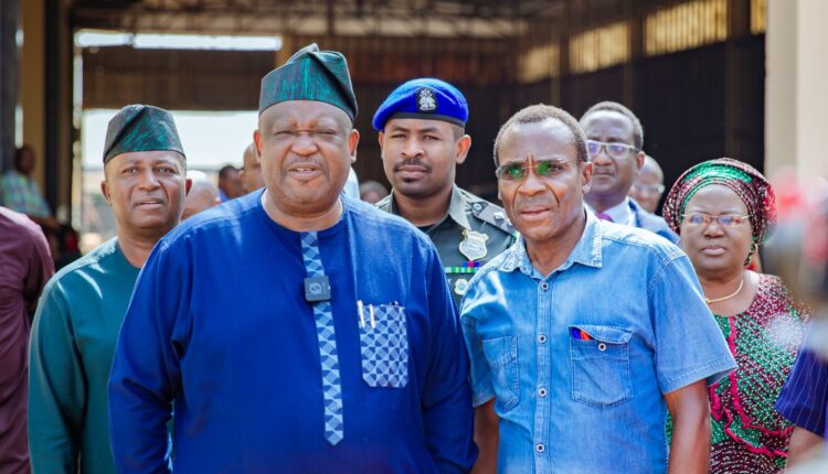 Plateau State Governor, Barrister Caleb Mutfwang with General Manager, Plateau Publishing Corporation, Mr. Chris Gyang, right, during the Governor’s visit to the company