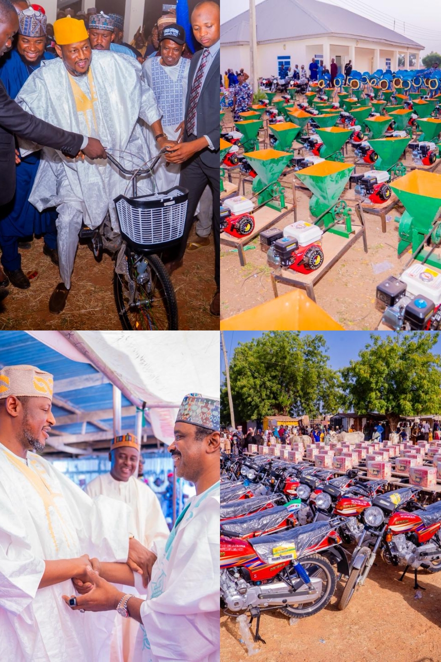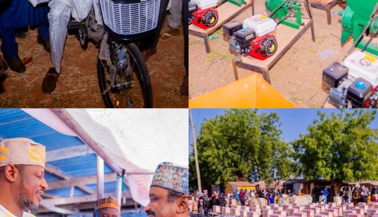 The items distributed included sewing machines, 100 grinding machines, 30 motorcycles, 4 operational vehicles, 6 cows, and ₦50,000 cash support for 50 beneficiaries drawn from various communities.