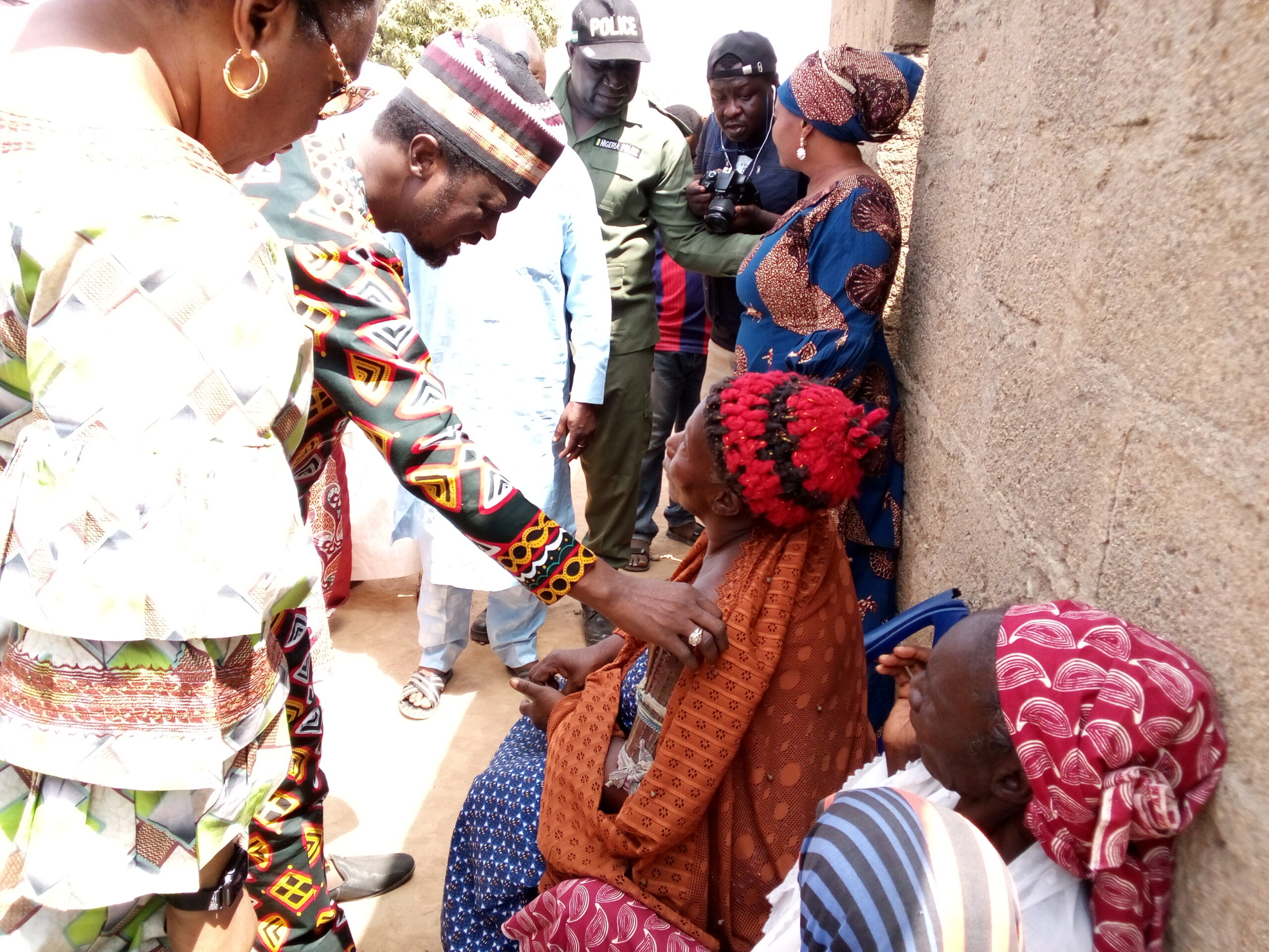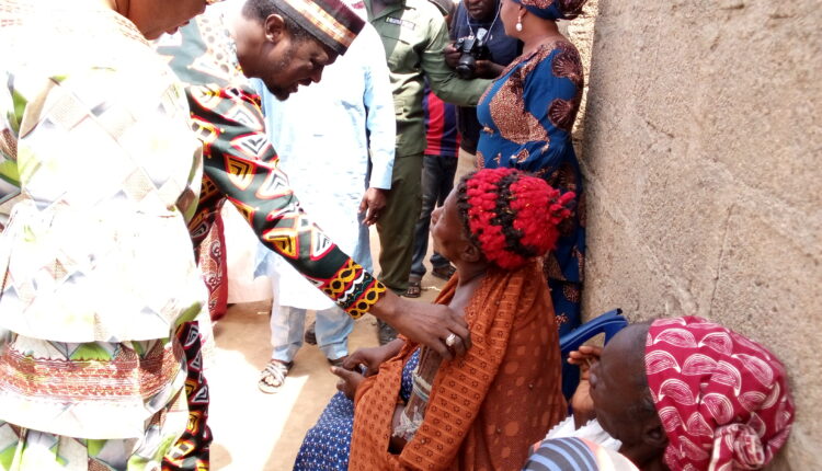 Taraba State governorship candidate of the Social Democratic Party, Hon. Danladi Baido and his wife, Mbatira, greets Mama Amanta Dagazo at Garba Chede who had a fractured arm on his way to Gembu on a Town Hall meeting on Wednesday.