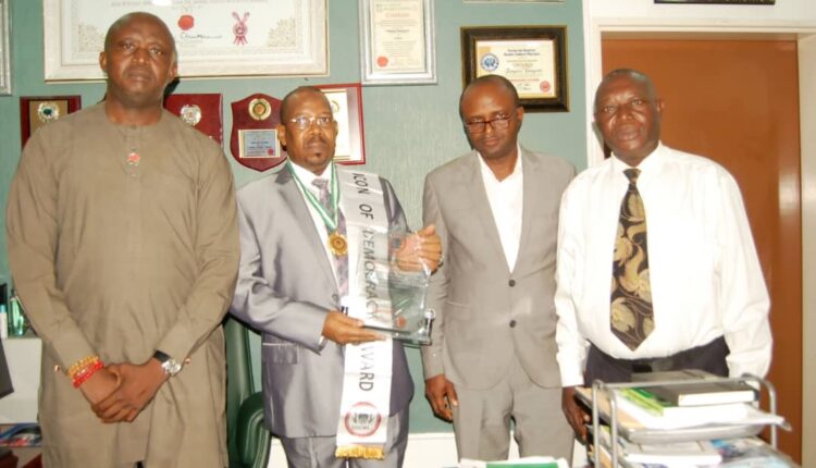 From left: Omoba Kenneth Aigbegbele, President GOCMEJ, recipient, Dr. Barrister Yahaya Danzaria, Clerk of the House of Representatives, National Assembly, Comrade James Okoronkwo, Secretary GOCMEJ and Comrade Sir Udeh Ejikeme, National Treasurer of GOCMEJ during the award presentation of “ICON of Democracy Award ” to the Clerk of the House of Representatives recently.