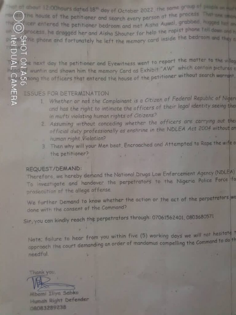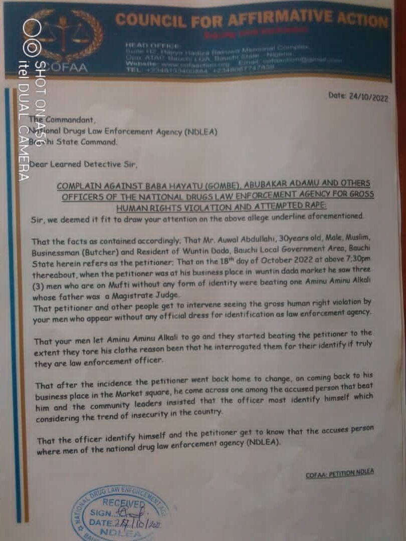 In a petition written by the organization acknowledged by the State Command of the NDLEA titled ‘Complain against Baba Hayatu (Gombe), Abubakar Adamu and other Officers of the National Drugs Law Enforcement Agency’ it alleged that the mentioned officers acted in a way that violated the human rights of the complaint, one Mal Auwal Abdullahi, a 30 year old butcher.