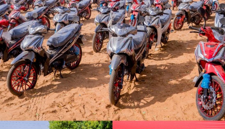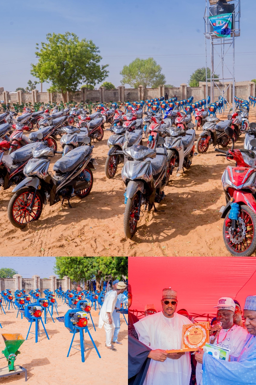 The items included 55 motorcycles, 100 sewing wheels, 100 grinding machines, 50 fridges, 100 pasta-making machines, 200 cartons of Indomie noodles, 200 crates of eggs, 100 bags of flour, motor vehicles, and ₦30.8 million in financial support to beneficiaries across the area.