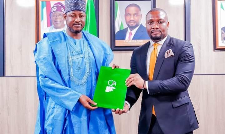 Katsina State Governor Dikko Umaru Radda, and Director General of SMEDAN, Mr. Charles Odii, right, after signing Memorandums of Understanding in Abuja Thursday.