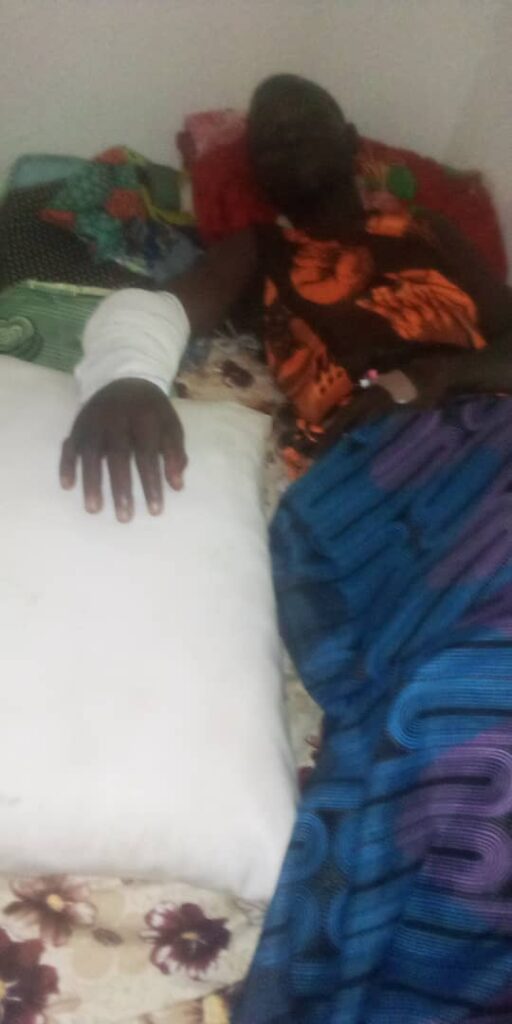 day that I started hearing gun shots from all directions on the process I was shot on my right elbow the bullet went through broke my bone and went out near my arm and later I was taken to this hospital after the bandits who were all in military three quarter shorts nickers abducted nine persons and left who are presently all in their custody I am very grateful that I am alive and recuperating”.