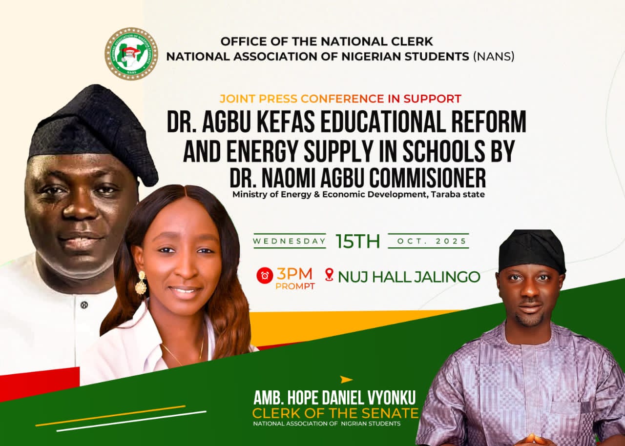 “Long live Dr. Agbu Kefas, long live Honourable Commissioner Naomi Tanko Agbu, long live NANS, long live Taraba State, and long live Nigeria,” the statement concluded.