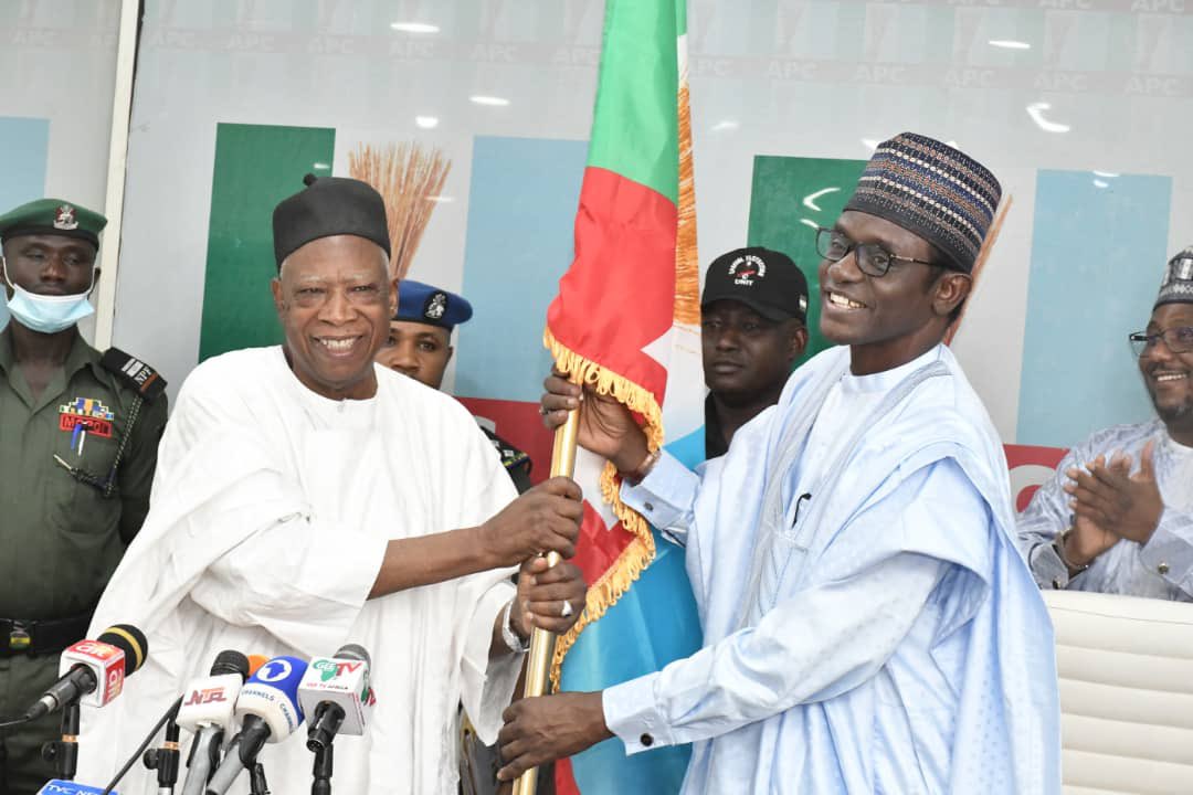 Senator Abdullahi Adamu receives the APC flag as mark of taking over as National chairman from Yobe Governor Mai Mala Buni who has been caretaker chairman, right