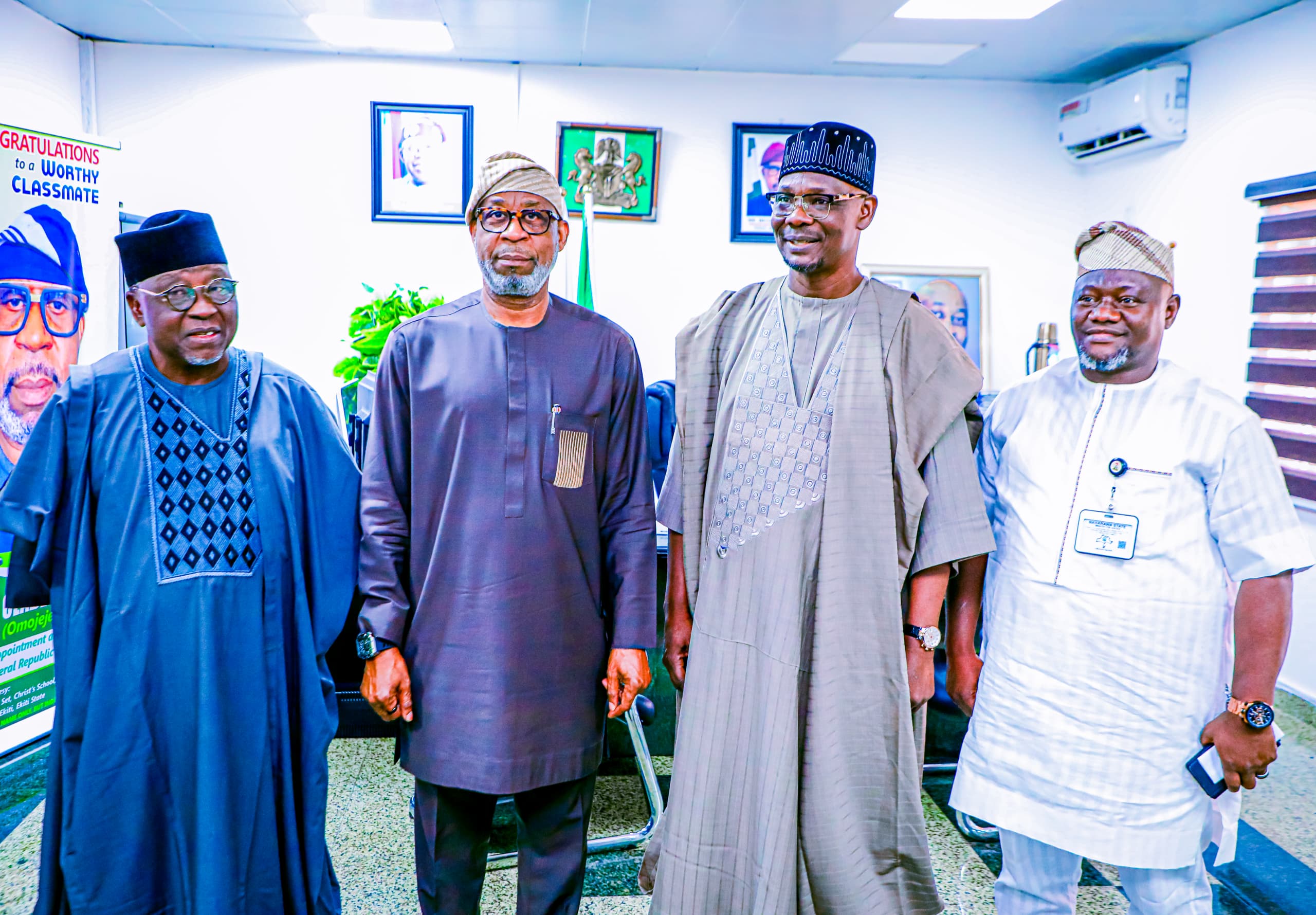 From left: Former Governor of Nasarawa State, Senator Tanko Al-makura, Minister of Solid Minerals Development, Dele Alake, Governor Abdullahi Sule and Commissioner of Justice, Barrister Labaran Magaji during a visit to the Minister in Abuja