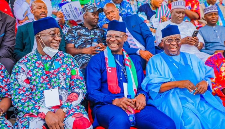 From left, Nasarawa deputy governor, Dr Emmanuel Akabe, Governor Abdullahi Sule and Senator Tanko Almakura at the APC convention at Eagles Square, Abuja